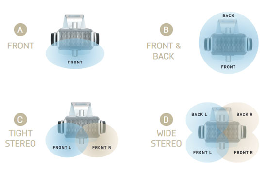 B. FRONT & BACK: данный режим особенно хорош для записи интервью, подкастинга, влоггинга, записи нескольких музыкантов и для записи игровых звуковых эффектов. Звук будет равномерно сниматься со всех сторон.