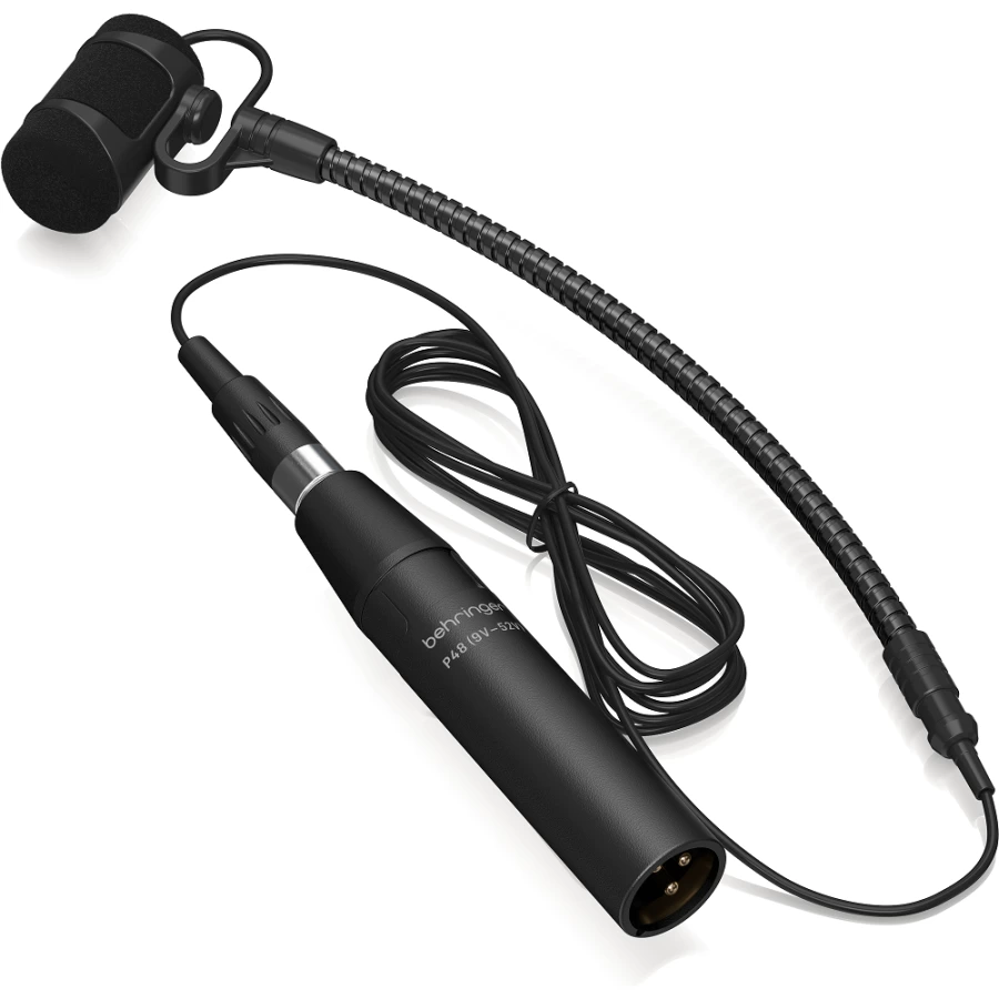 Микрофон имеет компактную конструкцию с эргономичным держателем на "гусиной шее", который позволяет разместить его под любым необходимым углом. Для подключения здесь предусмотрен встроенный кабель с коннектором XLR, а также адаптер фантомного питания.