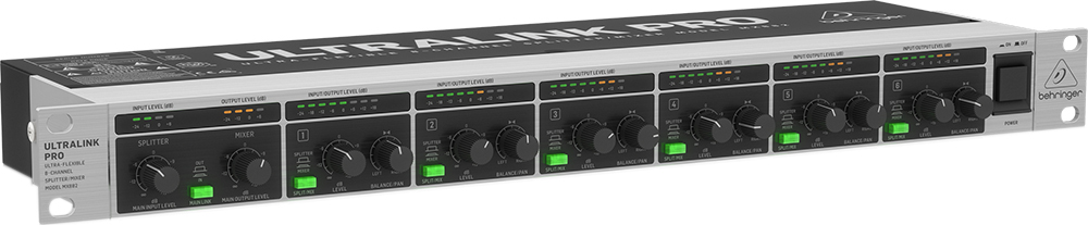 MX882 позволяет проводить сложную маршрутизацию сигнала по двум схемам микширования и сплиттирования. При этом режим работы задаётся не для устройства в целом, а для каждого канала в отдельности. Для этой цели в каждой секции контрольной панели имеется переключатель сплитта/микса, собственные регуляторы уровня и баланса/панорамирования, и отдельная восьмиуровневая шкала уровня сигнала, входного или выходного – в зависимости от текущего статуса канала. Диапазон изменения уровня сигнала стандартен для профессиональной аудиотехники – от -10 dBV до +4 dBu.