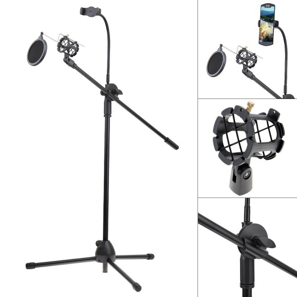 Напольная стойка для микрофона с регулируемой высотой, подходит для людей с разным ростом и предназначен для профессиональной деятельности в таких сферах как: интервью, презентации, skype, интернет телефония, студийная звукозапись, голос за кадром, игры, публичные выступления. Высококачественный металлический материал, 3 прочные и устойчивые складные ножки с противоскользящими резиновыми прокладками. Стрелу для микрофона журавль длиной 72 см можно настроить на лучший угол использования. Поставляется с держателем телефона, который поддерживает большинство смартфонов на рынке, вращающимся на 360 °. Дизайн и гибкая трубка позволяют пользователям свободно регулировать угол и положение смартфона. Напольная стойка надежно удерживает мобильный телефон и микрофон без провисания, что идеально подходит для студийной или наружной звукозаписи, вещания, телефонного караоке, подкастинга и т. д. В комплект входит: напольная складная стойка, антивибрационный монтаж, защита от ветра с держателем, держатель телефона с гибкой трубкой.