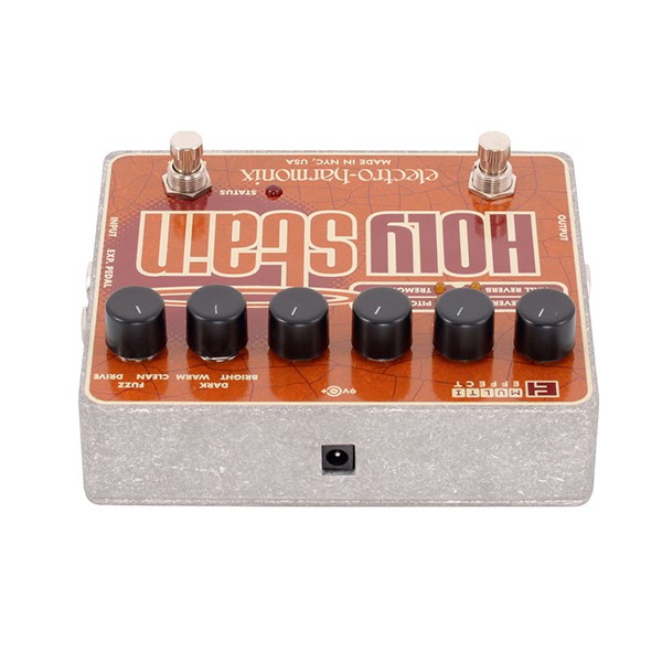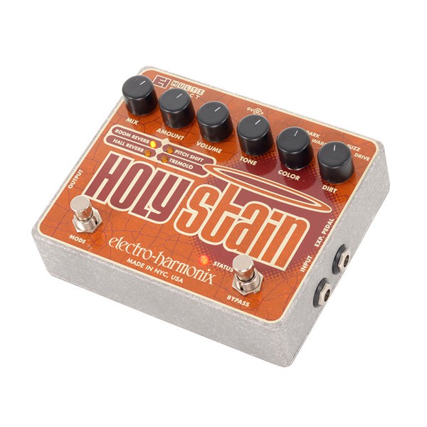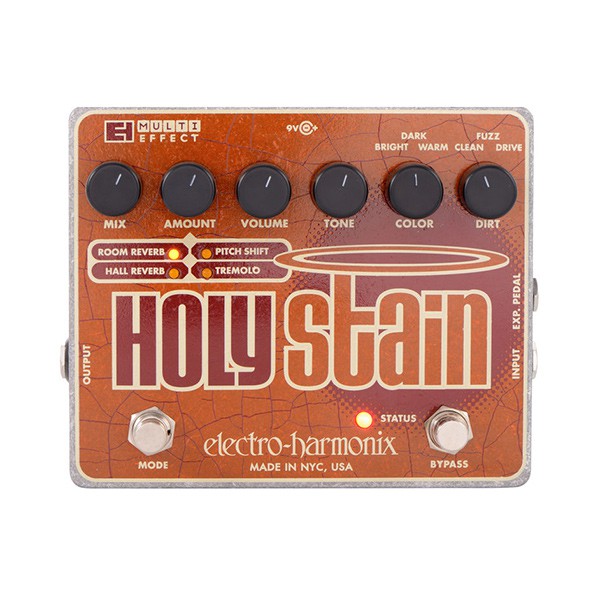 Electro-Harmonix Holy Stain – педаль эффектов которая совмещает в себе 4 эффекта: Distortion, Reverb, Pitch, Tremolo. Педаль имеет 6 регуляторов Mix, Amount, Volume, Tone, Color, Dirt. Педаль имеет 2 входа – один для инструмента, второй для педали экспрессии, и 1 выход. Так же гнездо для подключения блока питания. Педаль позволяет подмешивать реверберацию, питч-шифтер и тремоло к аналоговым Drive и Fuzz эффектами (которые также имеются в данной педали) для достижения неповторимого звука. Имеется три режима оттенка звучания: Bright/Dark/Warm.