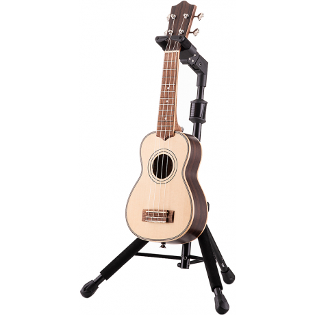 У данной модели крайне устойчивое треножное основание с прорезиненными наконечниками, предотвращающими скольжение. Ее высота легко регулируется в пределах от 575 до 815 миллиметров с помощью специального зажима, оснащенного штифтом. Все места соприкосновения с инструментом покрыты специальным прорезиненным материалом, который совершенно безопасен для отделки гитары и очень износостоек, за счет чего будет выглядеть как новый даже спустя долгое время. Стойка подойдет как для маленьких укулеле сопрано, так и для достаточно крупных укулеле баритон.