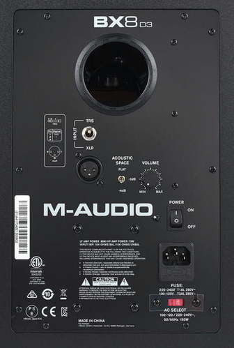 Монитор M-Audio BX8 D3 контролирует индивидуальные настройки звука в вашем пространстве, благодаря чему вы всегда будете испытывать наиболее точное воспроизведение звука. Также предусмотрен переключатель «Acoustic Space», который позволяет контролировать воспроизведение баса в зависимости от расстояния АС до стены.