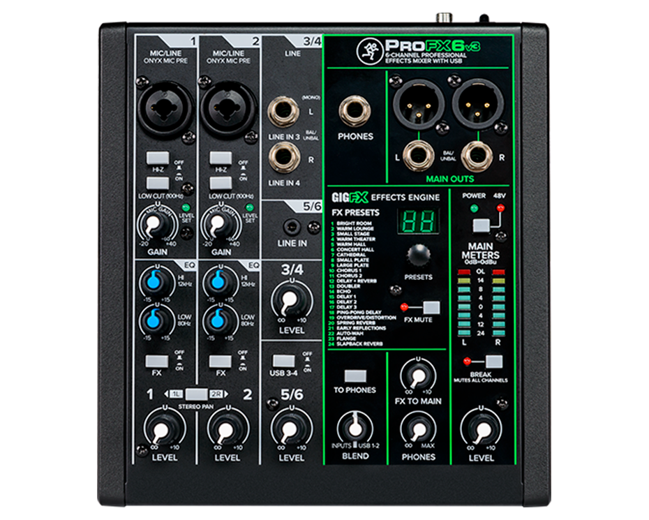 Mackie ProFX6v3 ― аналоговый микшерный пульт с 2 микрофонными предусилителями, 2 стереоканалами, 2-полосным эквалайзером, фантомным питанием, встроенным процессором эффектов GigFX и функцией USB-аудиоинтерфейса.