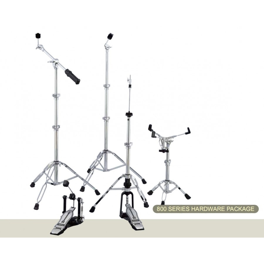 Он состоит из двух стоек для обычных тарелок, стойки для хай-хэта с педалью, стойки для малого барабана и стойки для бас-бочки. Это прочные устойчивые складные стойки со сдвоенными ножками для дополнительной стабильности. Этот набор позволит вам установить стандартный набор тарелок и полноценно использовать вашу барабанную установку.
