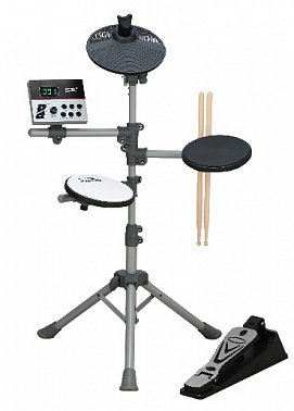 Электронная ударная мини-установка Soundking SD20 со складной конструкцией, регулируемой высотой, полыми пэдами тарелок и очень компактными размерами. В комплект установки входит звуковой модуль SD50, пэд малого барабана, пэд тома, пэд тарелки хай-хэта и педаль бас-бочки. Все пэды установки однозонные. Звуковой модуль SD50 оборудован 108 высококачественными тембрами барабанов и перкуссии, 10 заводскими пресетами и двумя слотами под пользовательские пресеты. Встроенный метроном с диапазоном 30-250 ударов в минуту, 10 демо-песен и возможность записи и воспроизведения собственной игры позволяют эффективно заниматься и развивать исполнительские навыки. Основной линейный выход оснащен парой разъемов 1/4”, для подключения наушников выделен 1/8” выход. 1/8” вход Auх In позволяет подключить смартфон или компьютер для игры под аккомпанемент. Вывод MIDI-сигнала доступен через пятиконтактный разъем.